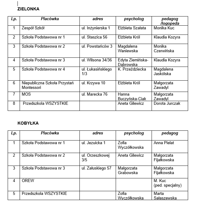 PLACÓWKI W REJONIE PORADNI PSYCHOLOGICZNO-PEDAGOGICZNEJ W ZIELONCE